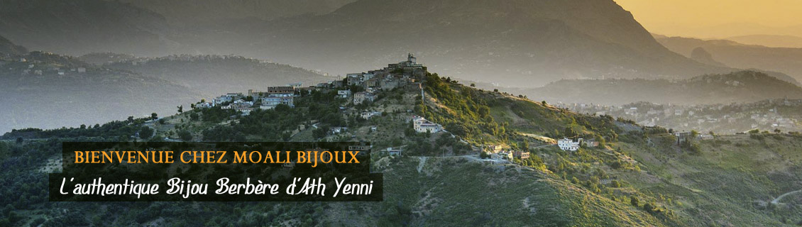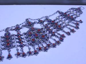 Le Collier Berbère est fait en argent formé de plaques rectangulaires et à plaque centrale en forme de croissant de lune, émaillées jaune, vert et bleu, et rehaussé de cabochons de corail et pendeloques, ou seulement en perles de corail.